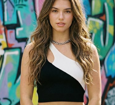 a woman in a cropped top and pants with a cropped topa woman in a cropped top and pants with a cropped top